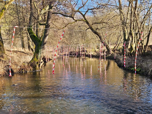 As a first step, ProtectFish researchers estimated the fish stocks (species, sizes, numbers/abundance) by conducting a series of electrofishing surveys on the Střela and Svatava rivers in late autumn 2025. Following this, visual exclusion barriers were installed, using UV-resistant white plastic ropes and red-and-white plastic belts to protect the selected river stretches from cormorant predation activities.